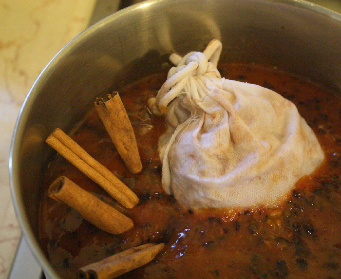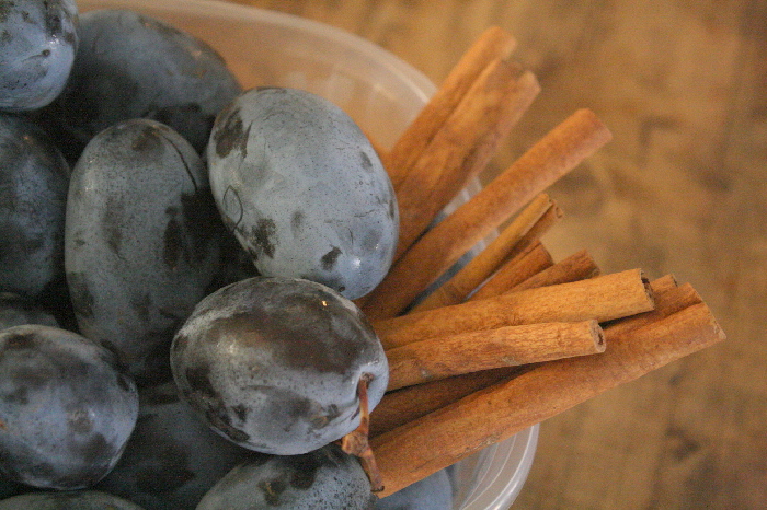 שמים את רסק השזיפים בסיר ומוסיפים לו את שקית הגלעינים ומקלות קינמון. במתכון אמרו שלושה מקלות לשלושה קילו שזיפים, אני שמתי ארבעה.