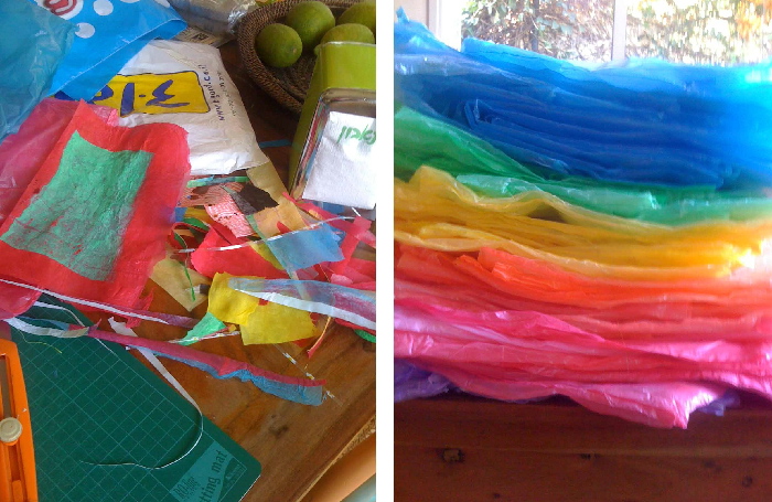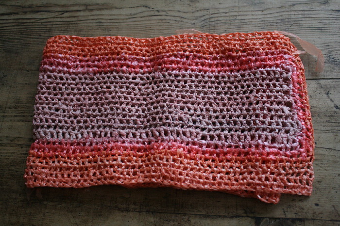 ניסיתי לסרוג עם השקיות. יוצא נחמד, אבל התוצאה הסופית לא ממש נעימה לי. לבסוף, מצאתי את עצמי מגהצת. למדתי את הטכניקה מיעל המקסימה שארגנה סדנאות בהן לימדה (לא יכולתי להגיע ממיליון סיבות לא עיניניות) ופניתי גם להדרכה שמצאתי אצל סיגלין וכך גיהצתי לי חומר גלם.