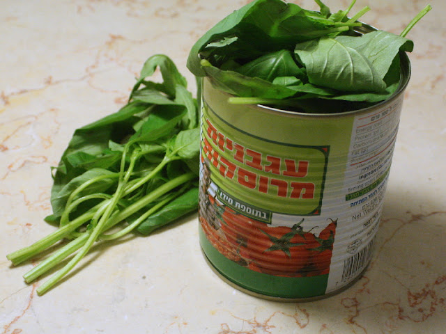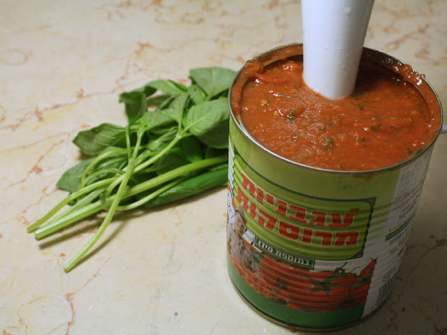 1. קוצצים עם בלנדר חצי חבילת בזיליקום לתוך העגבניות המרוסקות. אין צורך להמליח בשלב זה כי יש תוספות שהן מלוחות מאוד. גם את שמן הזית אני מוסיפה בעת הרכבת הפיצה כי לא תמיד מתאים להוסיף שמן זית.