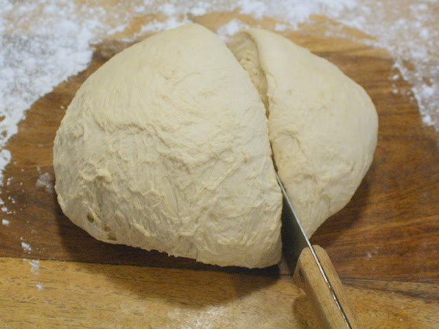 8. חותכים את הבצק לשלושה חלקים. כל אחד מהם יכול להיות פיצה שלמה שתחתך למנות לאחר האפיה.