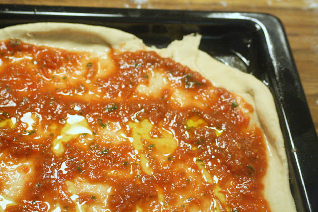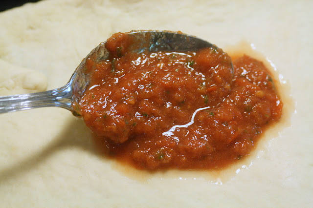 2. מניחים עם כף את הרוטב המרוסק על הפיצה ושומרים מסביב על שוליים יבשים. לטעמי אין להעמיס ברוטב והכמות המוצעת בצילומים היא האופטימלית.
