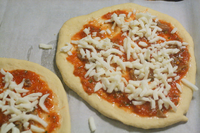 15. מפזרים את האנשובים בצורה אחידה ע"ג ארבע הפיצות. האנשובים מאוד מלוחים והם יתבלו יפה את הפיצה ללא תוספת מלח.