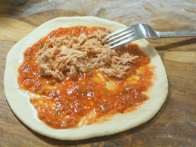 9. מוסיפים ¼ קופסה של טונה מסוננת מן הנוזלים ופורסים אותה על ½ מהפיצה.