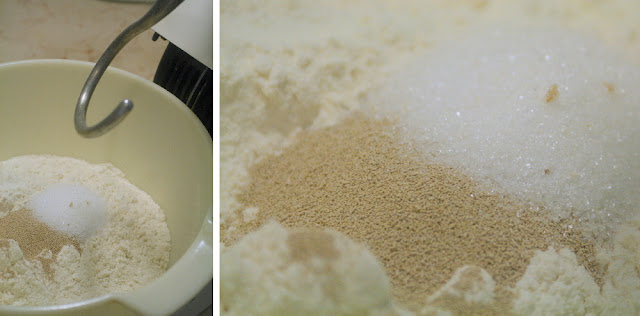 1. שמים בקערת המיקסר את הקמח, השמרים והסוכר.