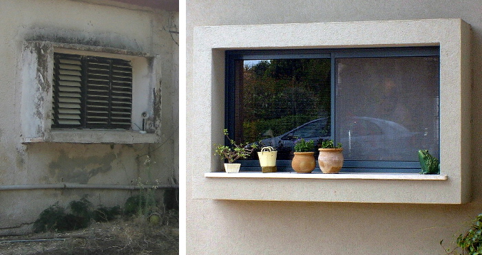 כשהגענו לשני החלונות הבולטים הסתבר שדעותינו זהות באי-האהבה שלנו לחלונות הבולטים, אולם מסיבות של חסכון כספי, בחרנו להשאירם כמות שהם, לשקמם ולשדרגם קלות.