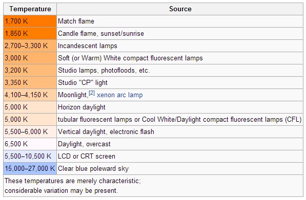| הטמפרטורה של מקורות אור שונים מתוך ויקיפדיה |