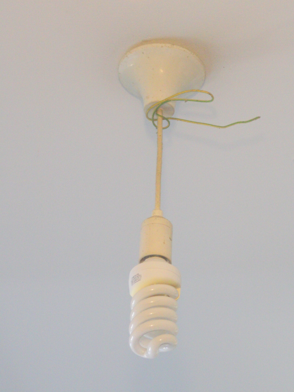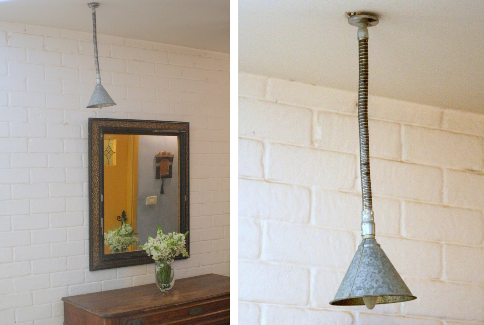 גוף התאורה השני עשוי פח מגולוון. כשדמיינתי אותו לעצמי, חשבתי שאצטרך להזמין את החלקים אצל פחח אך בביקור שיגרתי בחנות גדולה לחומרי בנין מצאתי משפך לנפט ואת הצינור שלו ורוזטה של ברז רגיל, להסתיר את החיבור לתקרה.